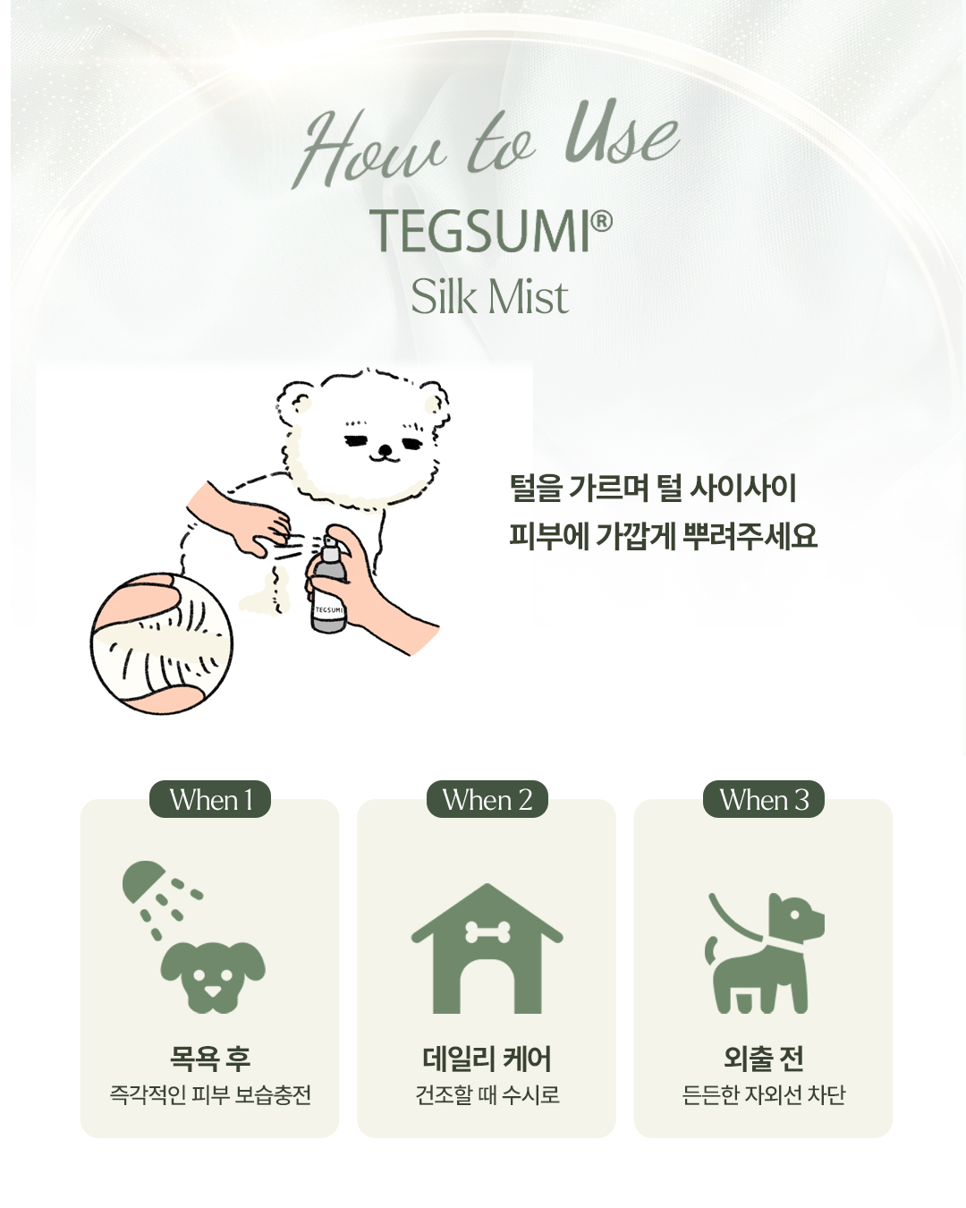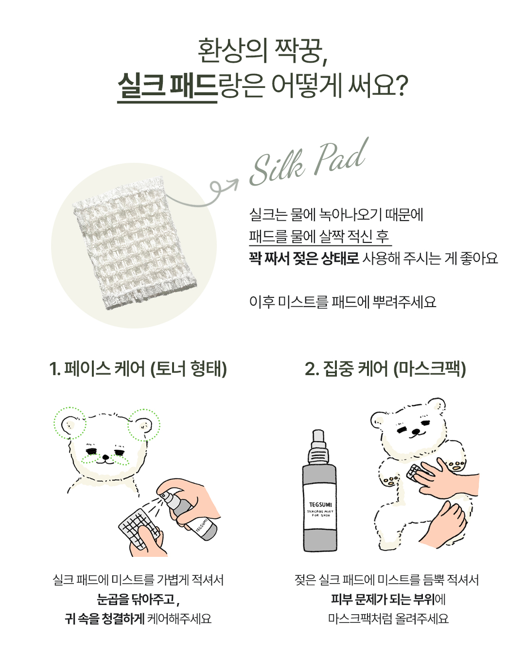 실크는 물에 녹아나오기 때문에, 젖어있는 상태로 사용하시는게 좋습니다!